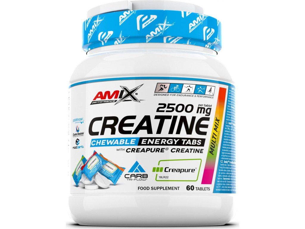 Amix™ Creatine 2500 mg Chewable Energy Tabs obsahuje Creapure® kreatin monohydrát (kreatin zvyšuje fyzickou výkonnost při po sobě jdoucích krátkodobých intervalech vysoce intenzivního fyzického výkonu; příznivého účinku se dosáhne při denním příjmu 3 g kreatinu) a je obohacen o Amix™ Carb Tri-Flow komplex pro udržení energie (ideální pro sportovce a aktivní jedince hledající rychlou a účinnou podporu svalové síly a regenerace).
