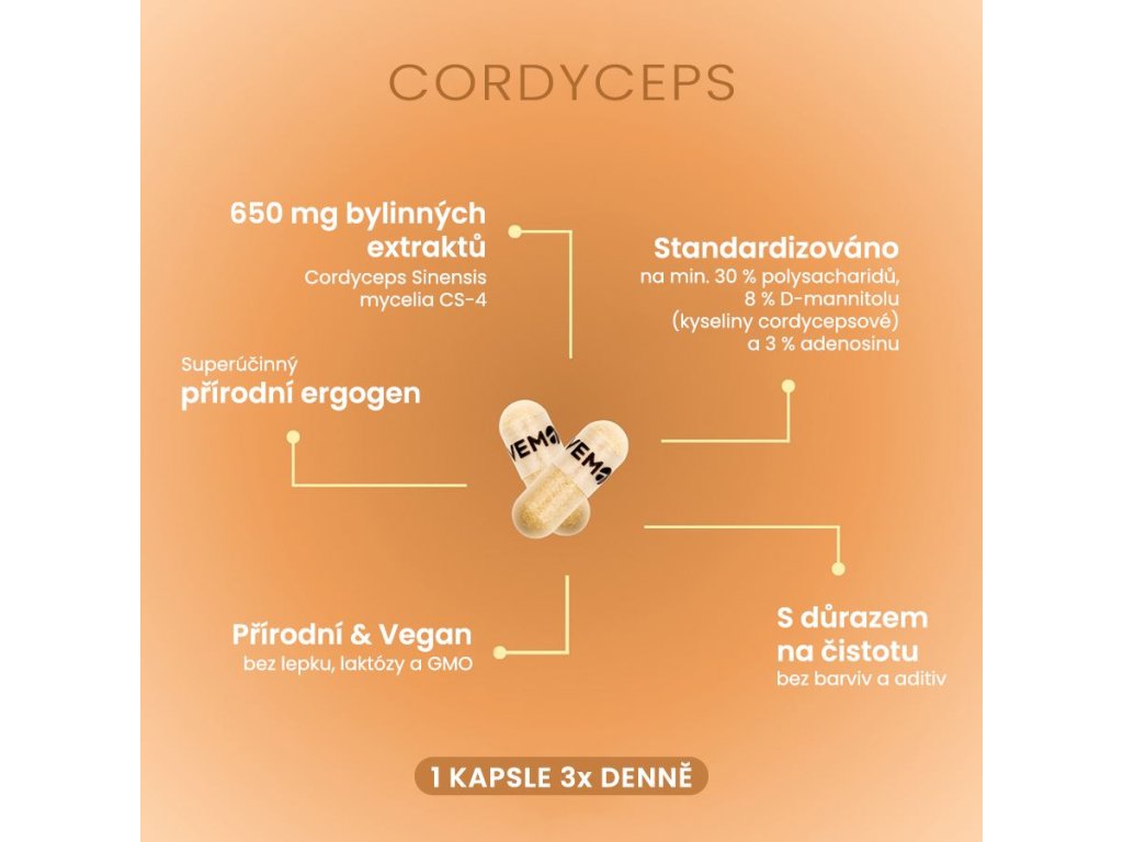 Cordyceps Sinensis mycelia CS-4 standardizovaný na min. 30 % polysacharidů, 8 % D-mannitolu (kyseliny cordycepsové) a 3 % adenosinu. | 650 mg | 1950 mg |