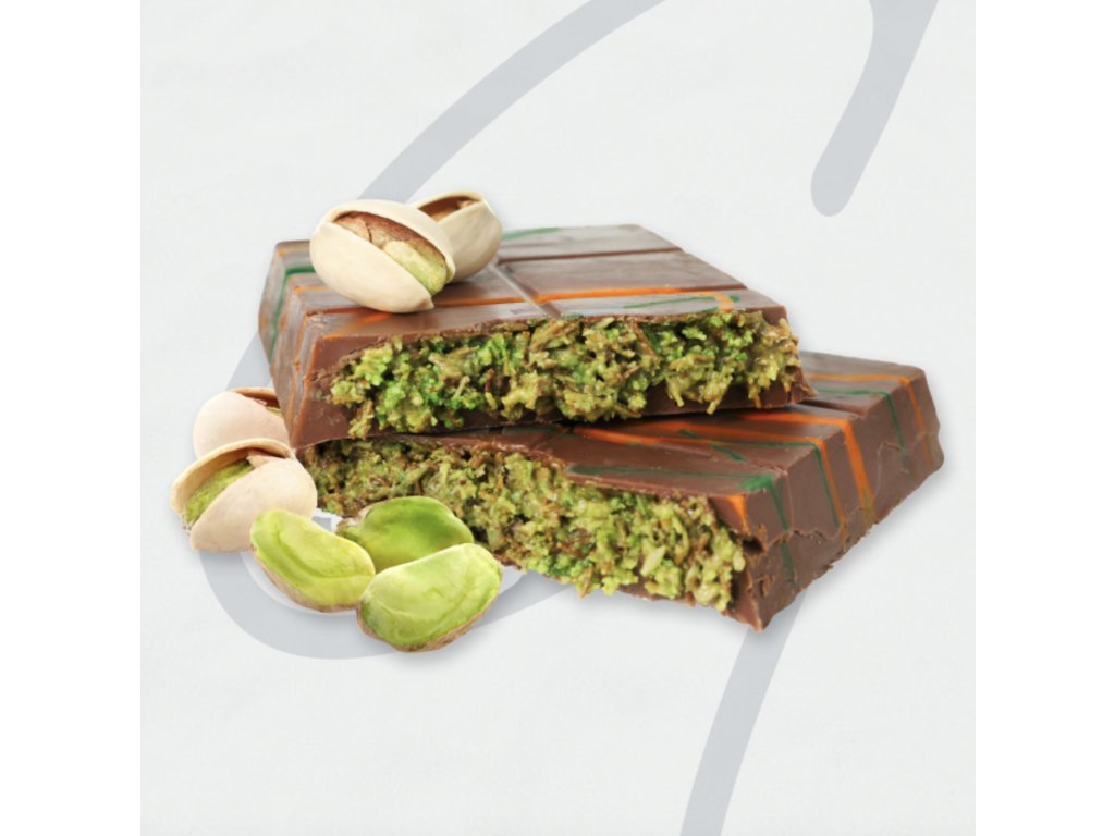 Mléčná čokoláda s pistáciovou náplní a kadayifem.
