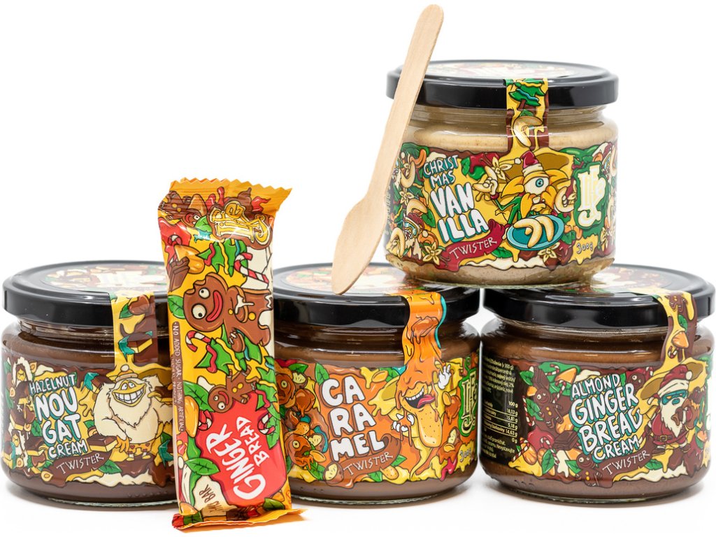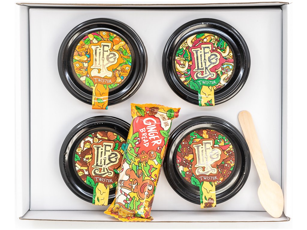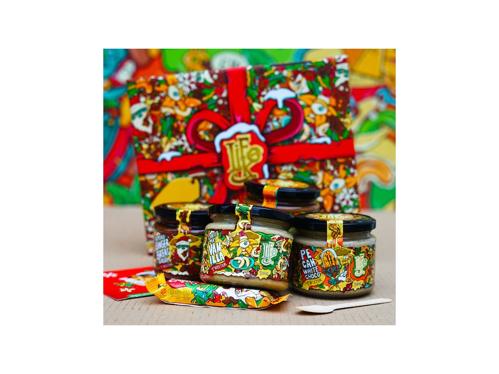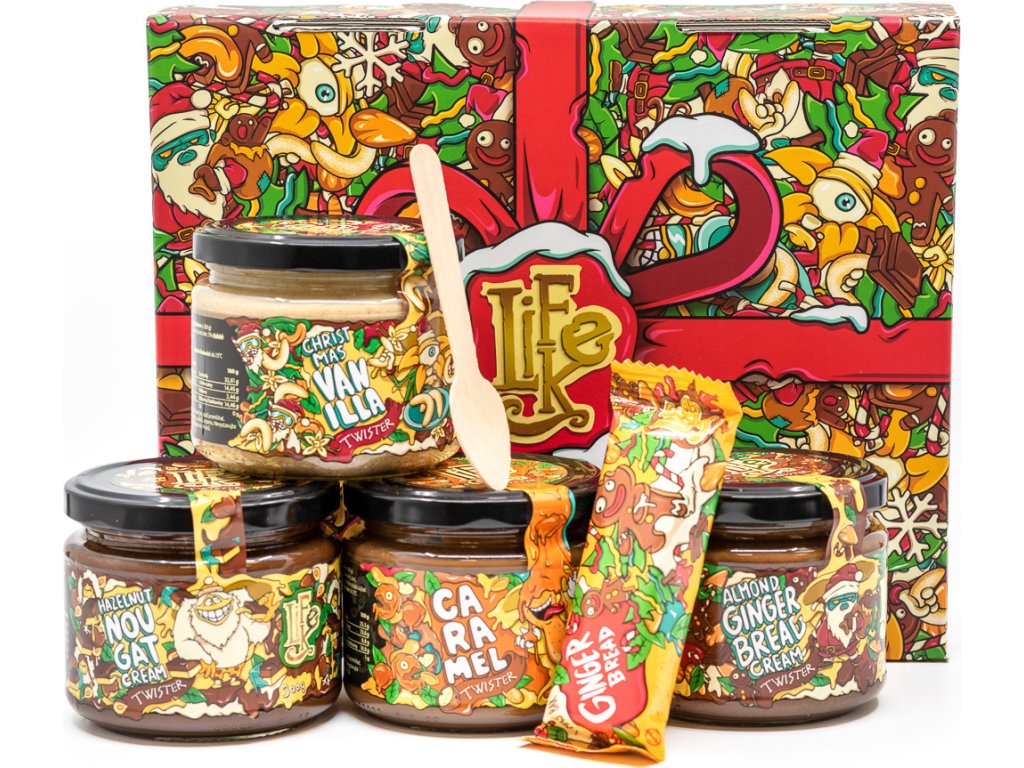 Dárková krabička LifeLike obsahuje vybrané oříškové krémy, tyčinku a lžičku: