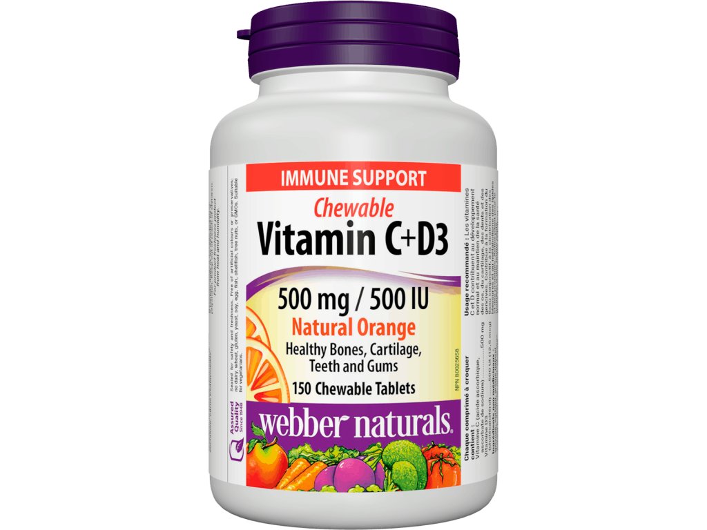 Webber Naturals nabízí doplněk stravy s obsahem vitamínu D3 v kombinaci s vitamínem C v netradiční formě, ve žvýkacích tabletách se skvělou pomerančovou příchutí. V jedné tabletě je obsaženo 12,5 mcg vitamínu D3 ve formě cholekalciferolu a 500 mg vitamínu C ve formě směsi kyseliny askorbové a askorbátu sodného.